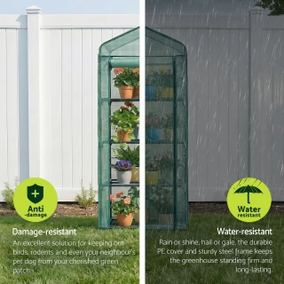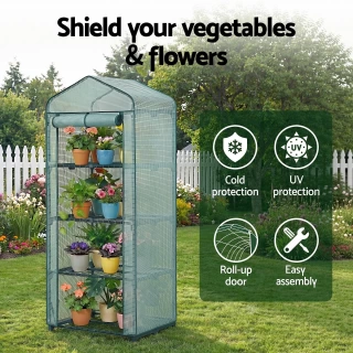 Growing greens in Australia can be challenging due to weather fluctuations. Our all-weather Greenhouse provides a consistent environment for optimal growth year-round. Perfect for home or light commercial use, it protects against extreme weather and pests. The durable PVC greenhouse retains heat for better growth and comes with all necessary fittings for easy setup. Enjoy fresh, home-grown greens and save money on groceries. Order your greenhouse today! Note: Position your greenhouse in a sheltered spot for best results.FeaturesPerfect for decks, patios, and small gardensRoll-up zipper door for easy accessIncludes 4 plant shelves for organizationWaterproof and weatherproof constructionRemovable PVC cover for easy cleaningTear-resistant material for added durabilityInnovative strap design for secure setupEasy installation with no tools requiredSpecifications:Frame: Powder coated frameCover: 140g/sqm PEDimension: 70 x 50 x 160cmAssembly required: YesPlease note: The item comes in 1 packagePackage Content(1) Green House x1(2) Assembly instruction x1This product comes with 1 year warranty
