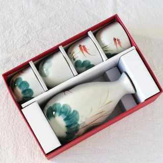 Perfect for serving sake, soju, or wine, the set includes one ceramic bottle and four cups, making it ideal for entertaining guests or enhancing your home barware collection. Each piece is beautifully finished with subtle brushstrokes and a smooth glazed surface, offering a refined way to enjoy your favourite drinks.